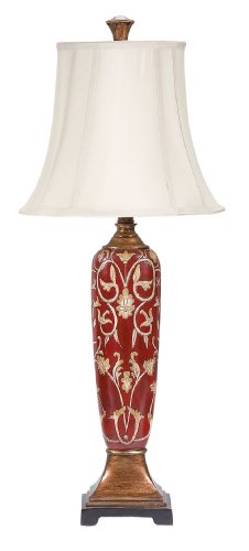 Table lamp with scroll base and hand painted design. Red and gold finish, Geneva taupe oval bell shade; 34-inch H, shade: 8-1/2-inch L by 13-1/4-inch W, 11-inch H. Uses 60w Bulb Max., UL Approved, 2-way switch. Brown Cord. Assembly instructions included. Polyresin.