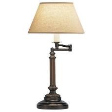 This table lamp has a swing-arm design, and makes a great reading lamp for a bedside table or desk. The candlestick base maintains traditional style, while ornate details encircle the base. The swing-arm is 9 inches when fully extended. The parchment shade has a deep camel color, which adds richness to decor. Uses a 60-watt bulb (not included). DL # 11195.