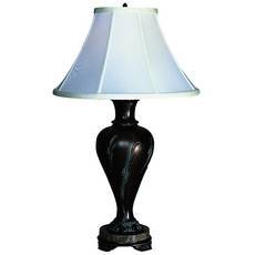 This table lamp features marble accents and small feet around the base. Gold-colored highlights add glitter to the marble. A leaf pattern draws attention to the lamp's curvaceous shape. Gentle piping nicely accents the white, hand-sewn shade. It takes a single, three-way, 150-watt bulb (not included), which allows a soft, medium or strong light. At 28 1/2-inches high, it's the perfect size for a table or desk. DL # 10849.